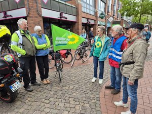 Am Sonntag um 11.15 Uhr trafen sich 6 Teilnehmer*innen des Grün-Teams (auf dem Bild fehlt der Fotograf) auf dem Marktplatz, um mit vielen weiteren Radfahrenden aus Langenhagen an der vom ADFC organisierten Sternfahrt nach Hannover teilzunehmen.