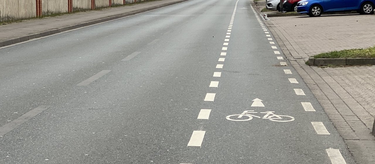 Zur Diskussion über die Sicherheit für Radfahrende in der Hackethalstraße in Langenhagen-Wiesenau hat die Ratsfraktion von BÜNDNIS 90/DIE GRÜNEN jetzt einen neuen Vorschlag beigesteuert. Auf der Ostseite der Fahrbahn soll ein Schutzstreifen für Radfahrende (mit durchbrochener Seitenlinie, siehe beispielhaftes Foto) aufgebracht werden, der von der Heinrich-Heine-Straße im Süden bis zur Einmündung der Straße An der Autobahn im Norden reichen soll.