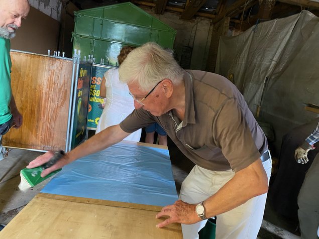 Zur Vorbereitung des Landtagswahlkampfes wurden die Dreieckständer mit den neun neuen Motiven zu den Hauptthemen Wirtschaft, Wohnen, Fahrradverkehr, Schule, Landwirtschaft, Mobilität, Naturschutz, Familien und Klima bestückt, nachdem in mühevoller Kleinarbeit die Reste der alten Plakate beseitigt worden waren. Wegen der großen Hitze (35°C) fand die Aktion im Maschinenschuppen von Heinrich Kohne in Schulenburg statt. Nach 1,5 Stunden war die schweißtreibende Arbeit durch die 8 routinierten Helfer*innen erledigt. Jetzt trocknen die Plakate und warten darauf am Sonnabend den Wähler*innen vorgestellt zu werden.